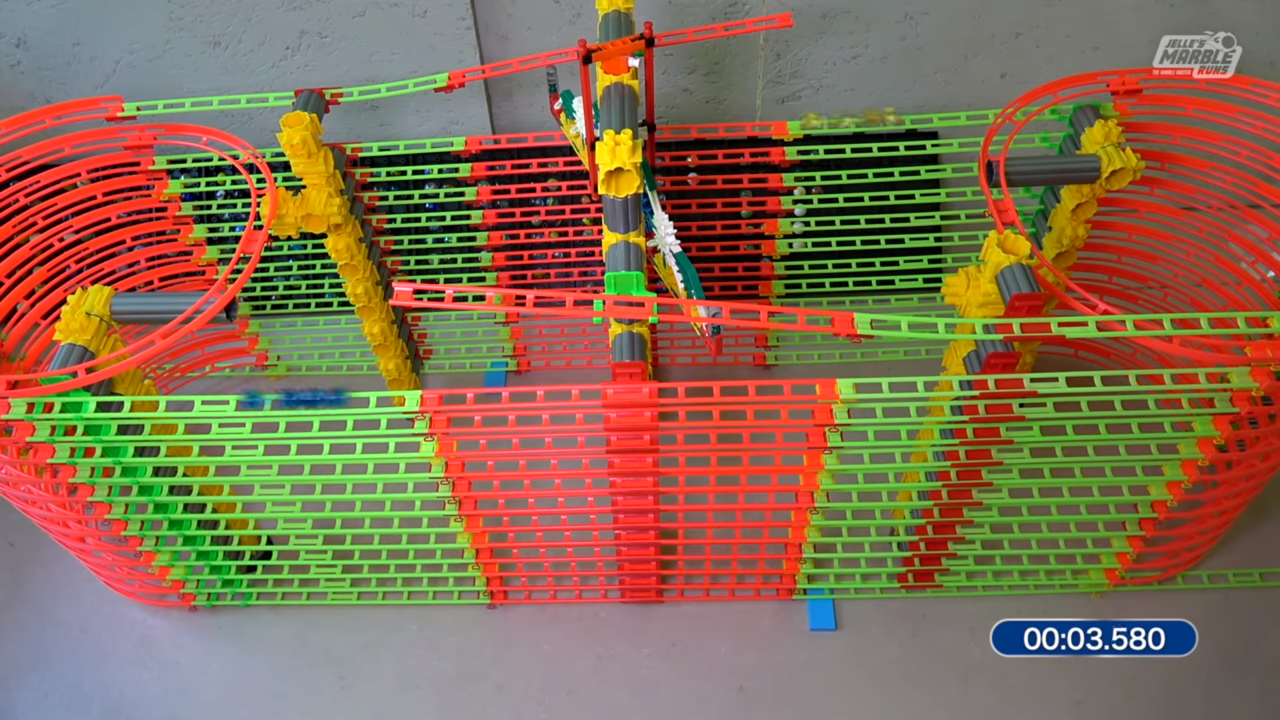 In the Team Pursuit, 2 teams of 4 marbles each roll down an oval-shaped track in opposite directions. The track is symmetrical, and consists of 6 laps. The team that reaches the finish first wins the race and moves on to the next round. Team members cannot be separated by more than 4 inches, otherwise the team is disqualified. The time is based on the front marble of each team.