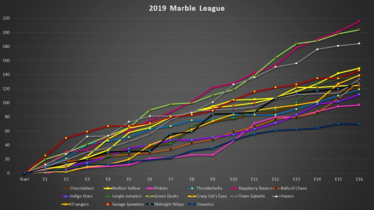 - This is the first Marble League that the Savage Speeders did not finish in the top 3. The Savage Speeders placed 1st in 2016 & 2nd in 2017 & 2018, compared to only 5th in 2019. To a greater extent, this is also the first Marble League in which none of the original teams from 2016 placed in the top 3.