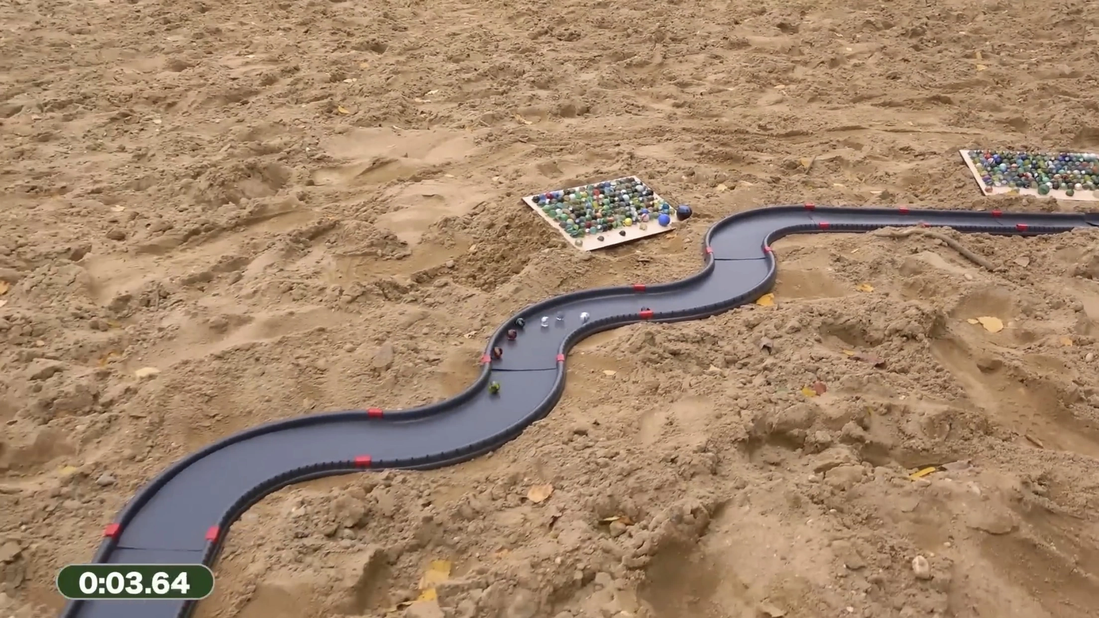 In the Triathlon, 8 marbles race down a course created with 3 sections: a section on gray "racing track" (made of the same track used in Marbula One), a sand rally section, and an underwater section. The first 4 marbles to cross the finish line in each heat advance to the finals, where the fastest marble to complete the course wins.