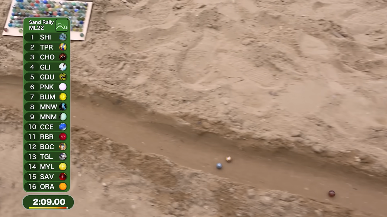 In the Sand Rally, 16 marbles from different teams race down a long and twisty track on a sand hill. The winner is the first marble across the finish line.
