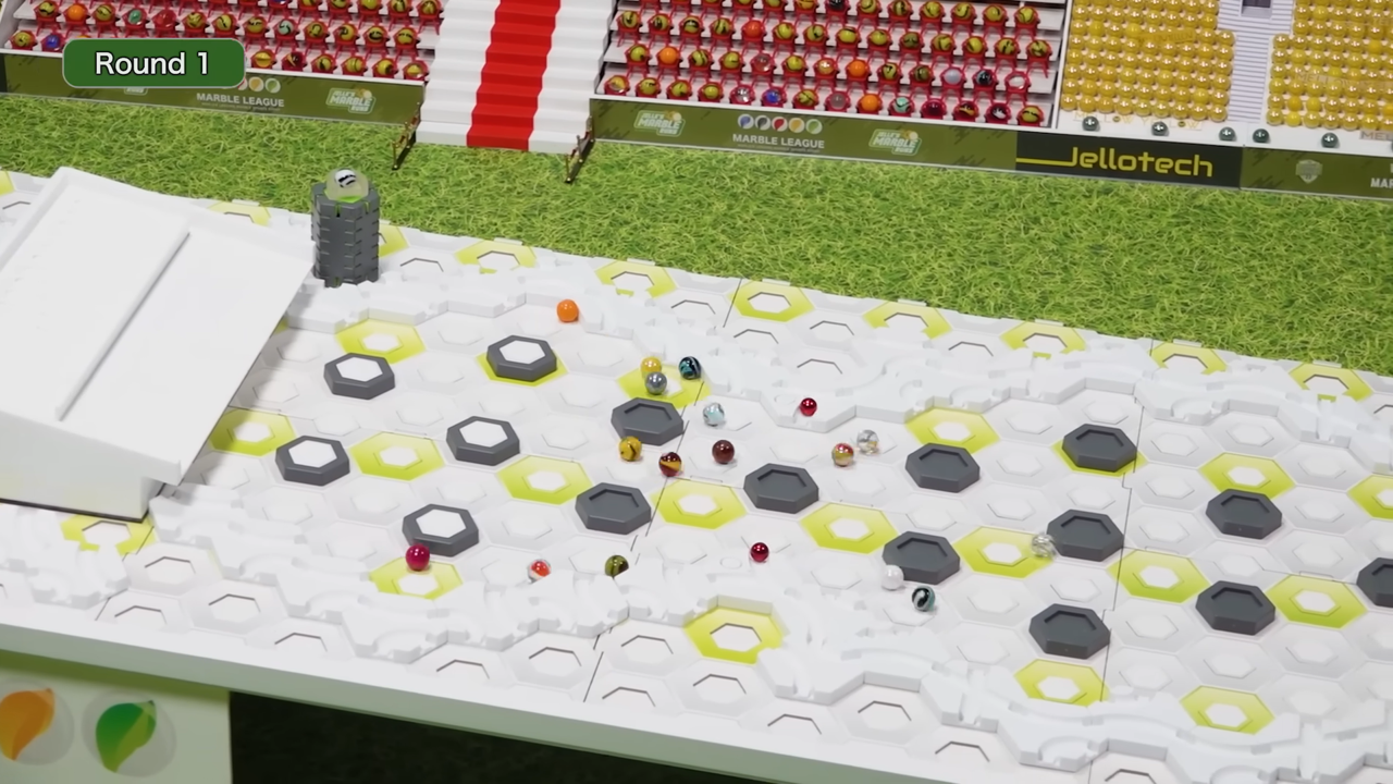 In the Elimination Race, 16 marbles race down a track constructed with Gravitrax pieces. The last marble to cross the finish line is eliminated from the event. If at least one marble stops moving, the one stranded closest to the starting line is eliminated, sparing the last marble to finish. The remaining marbles compete in another round with the same rules, and the process is repeated until only 1 marble remains, who is then declared the winner of the event.