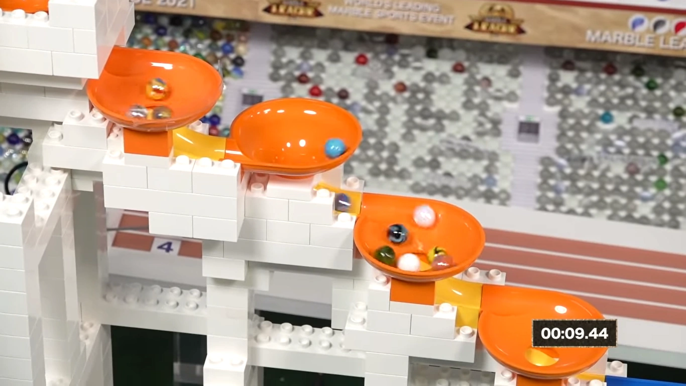 The race is similar to previous Funnel Races. It features ten funnels. The first five funnels are regular orange Hubelino funnels. These are then followed by two blue funnels, and finally three green MaBoRun funnels. The last marble to exit the final funnel wins.