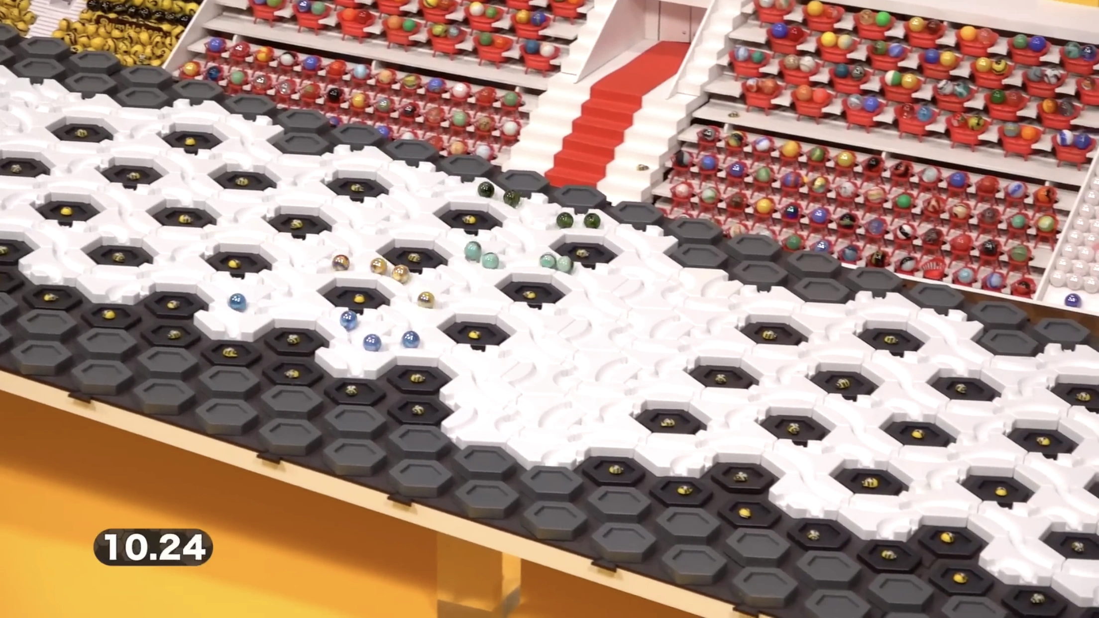 The Honeycomb Team Pursuit is an enlarged version of the Gravitrax Slalom featured in 2019. 4 teams of 4 marbles each race down identical tracks made out of Gravitrax pieces. A team's timer stops when 3 of their marbles finish the course. The 2 teams with the fastest times (after penalties, see below) advance to the next round.