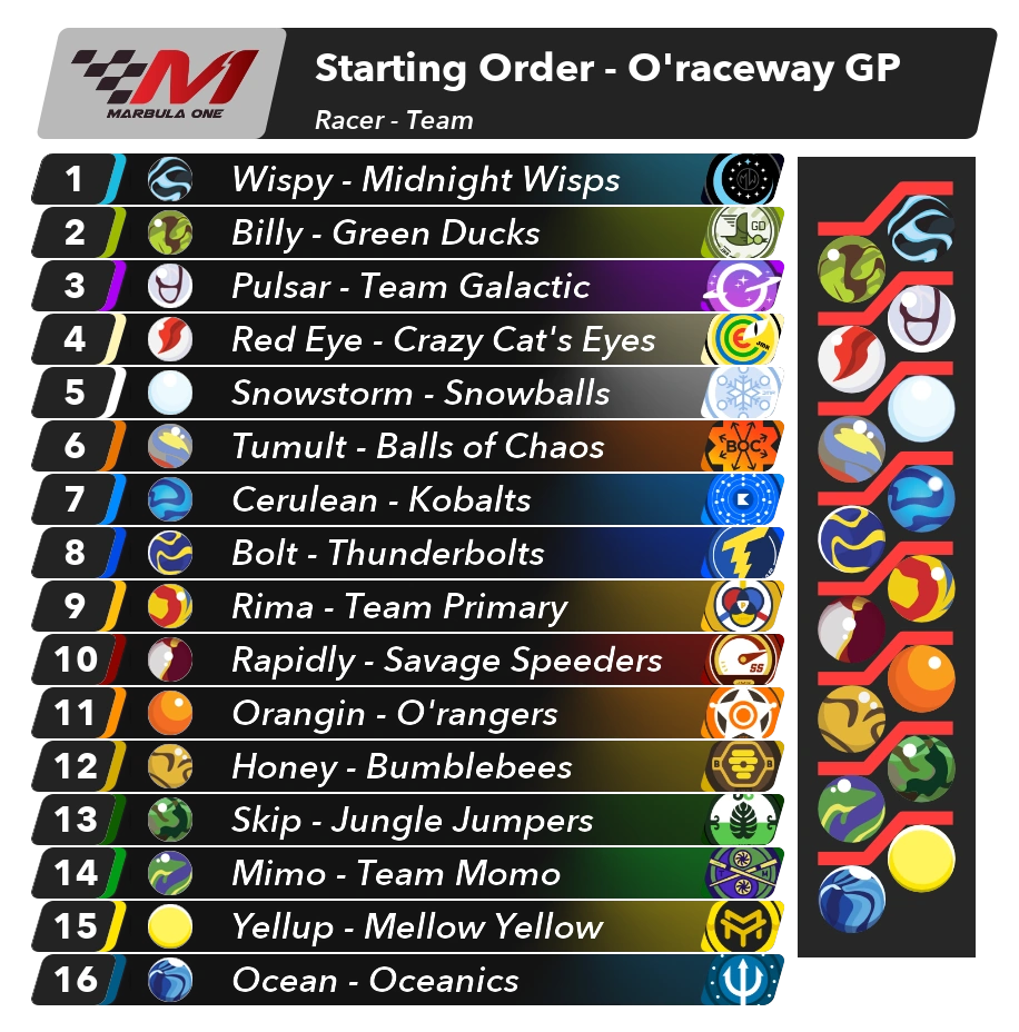 | Pos. | Marble | Team | Laps | Time | Delta | Grid |