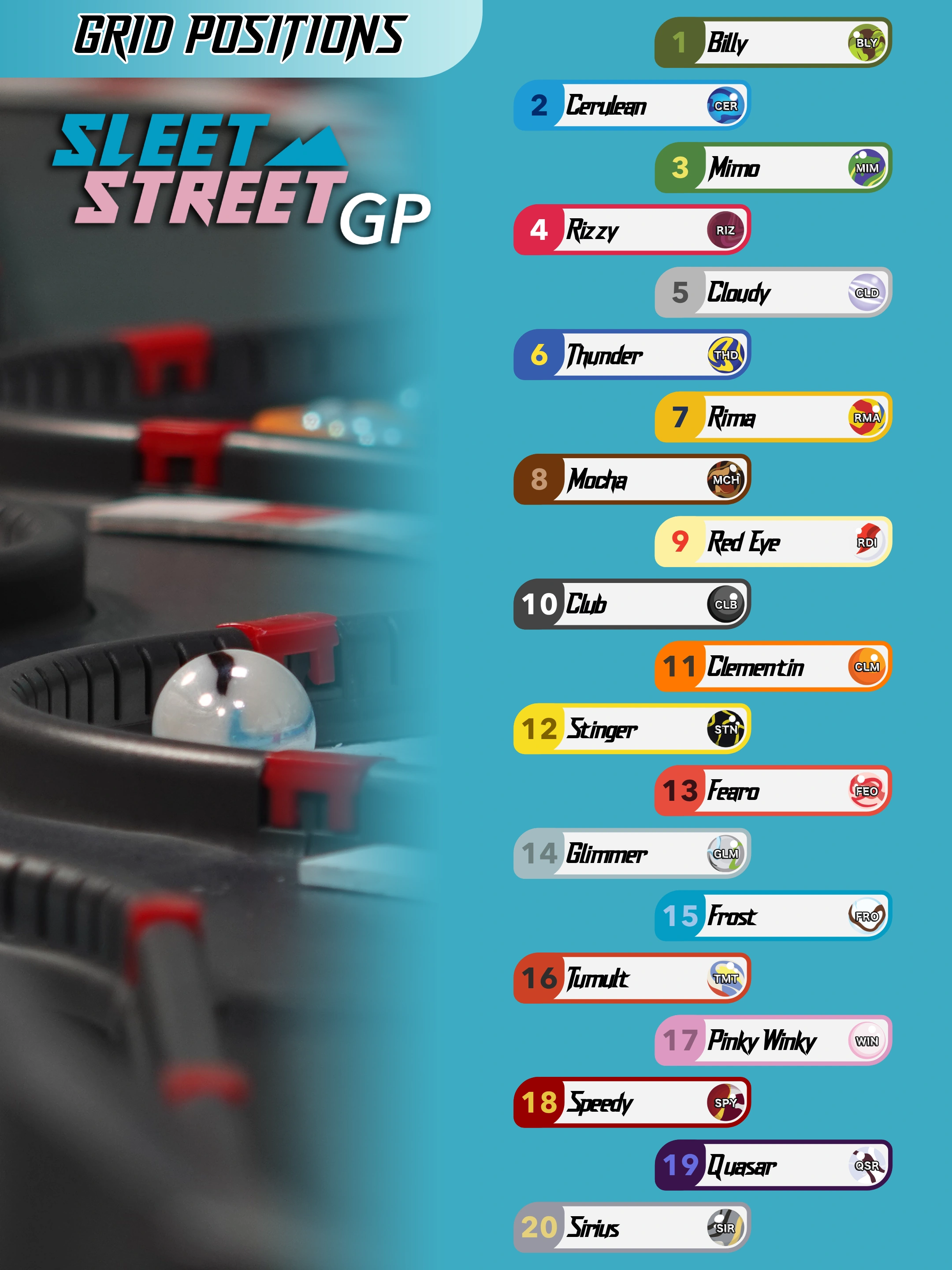 The race entrants for the Sleet Street GP.